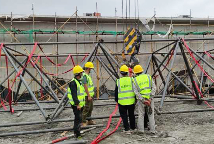 5、華亭煤礦網(wǎng)架工程網(wǎng)架安裝前應(yīng)熟悉圖紙,了解施工工藝,弄清節(jié)點(diǎn)構(gòu)造,掌握節(jié)點(diǎn)構(gòu)造,掌握施工方法,注意安裝順序。